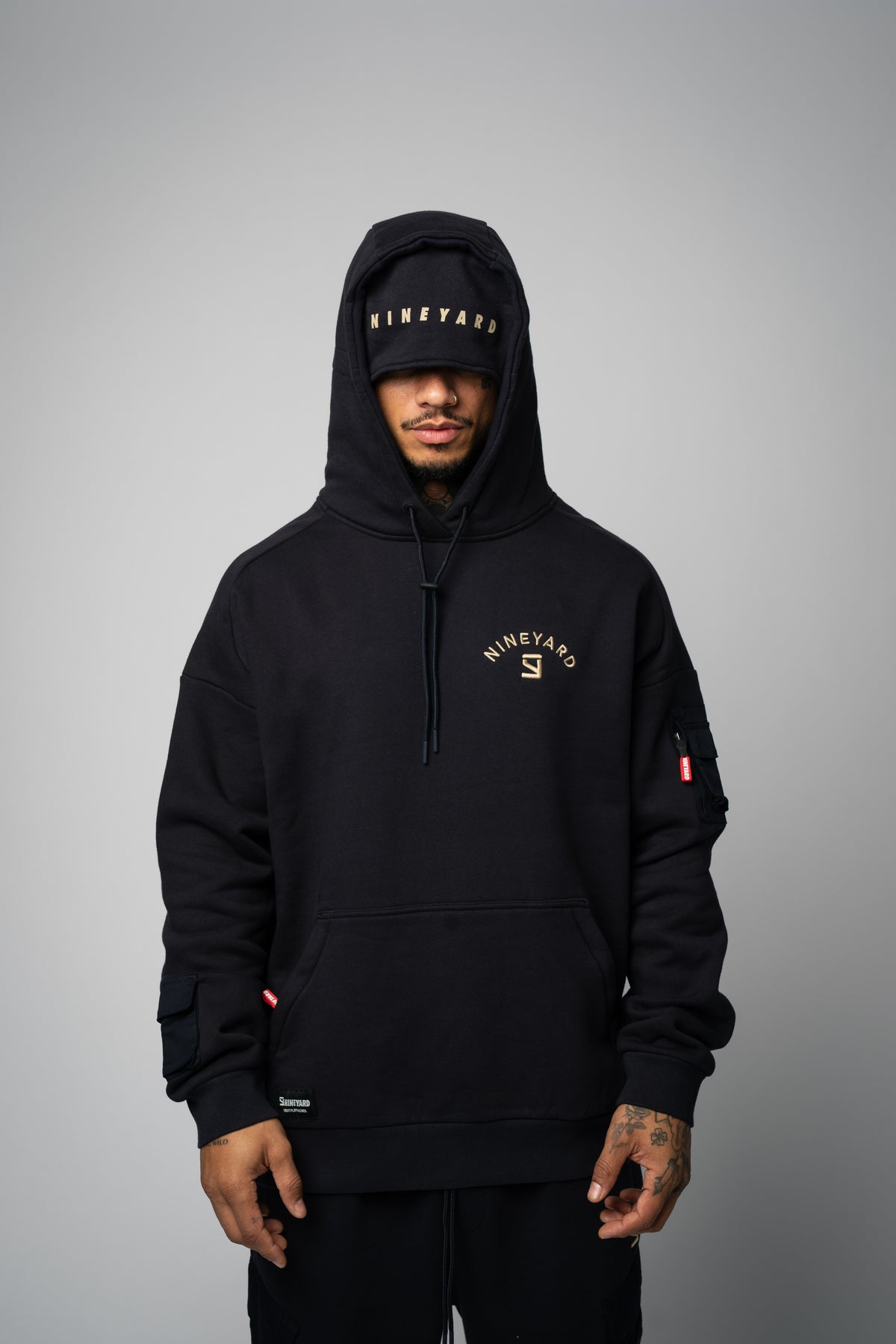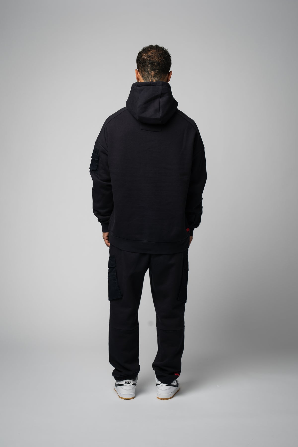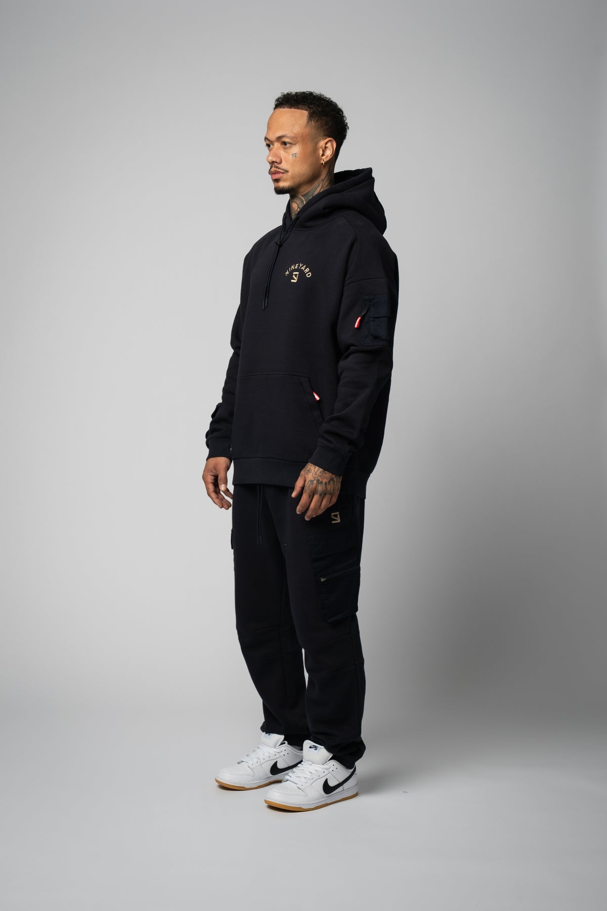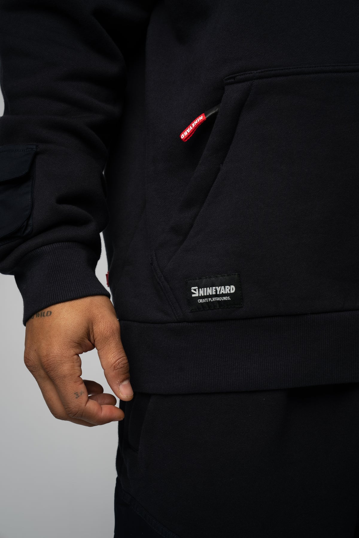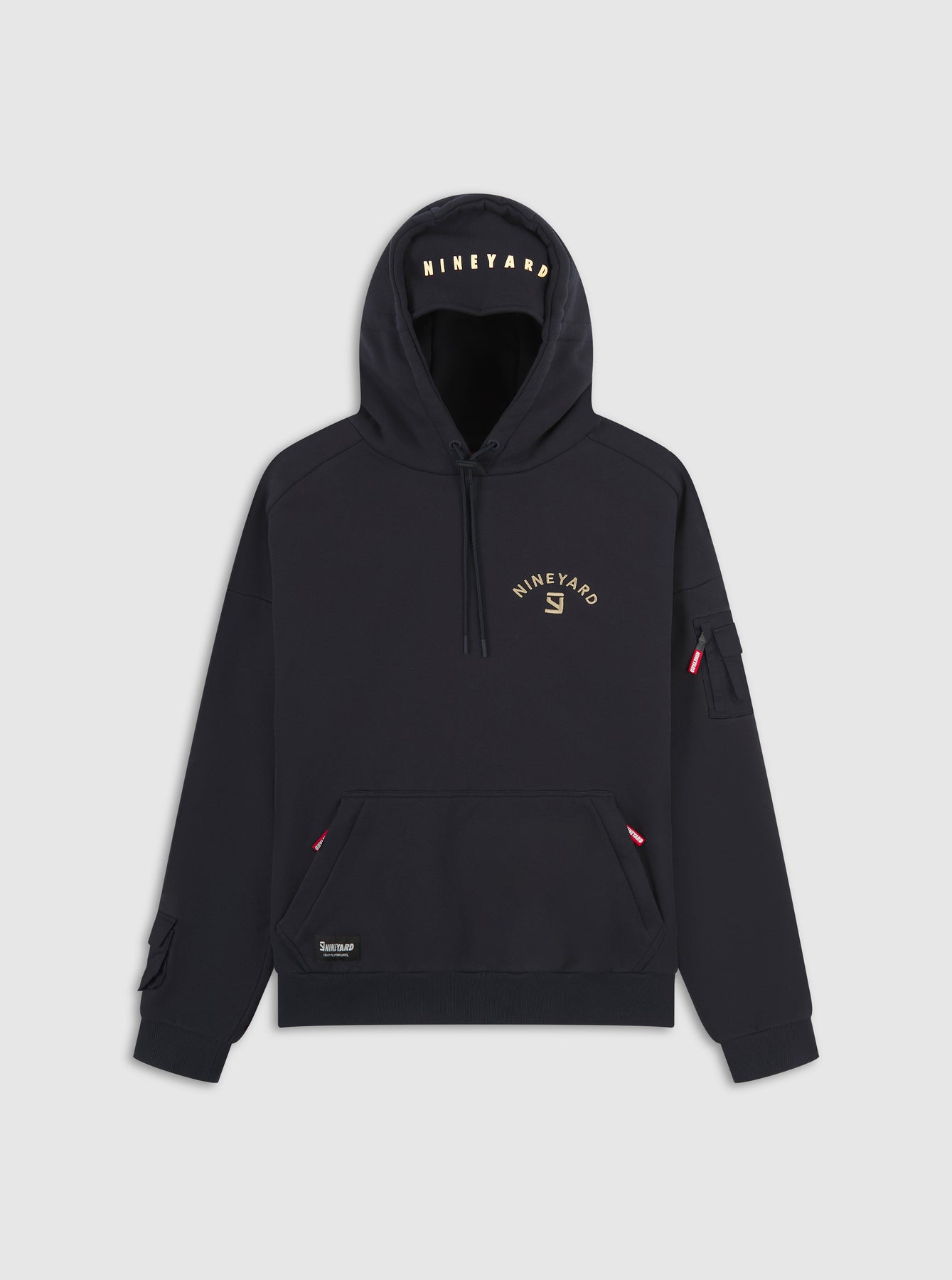 Jet Oversize Hoodie mit hochwertigen, detailreichen Printapplikationen auf Brust und Kapuze. Die doppellagige Kapuze lässt sich im Kopf- und Halsbereich fixieren und bietet zuverlässigen Schutz vor Wind und Kälte. Eine aufgesetzte Fronttasche mit verdeckten Reißverschlüssen sorgt für Funktionalität bei einem cleanen, minimalistischen Look. Subtle understatement with a strong attitude.